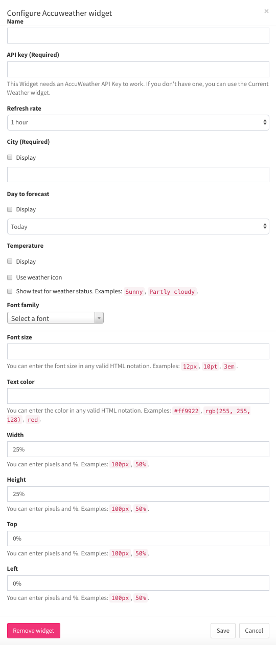 Click "Display" if you want the forecasted day value to be shown on the screen. Most will use a Text Widget for this purpose as it provides greater flexibility. More information on the Text Widget here.